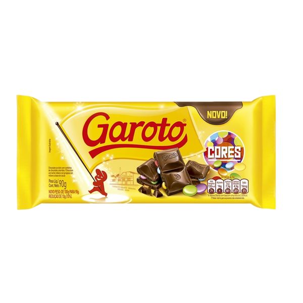 O Tablete Garoto Cores é uma combinação de chocolate ao leite com confeitos de chocolate.